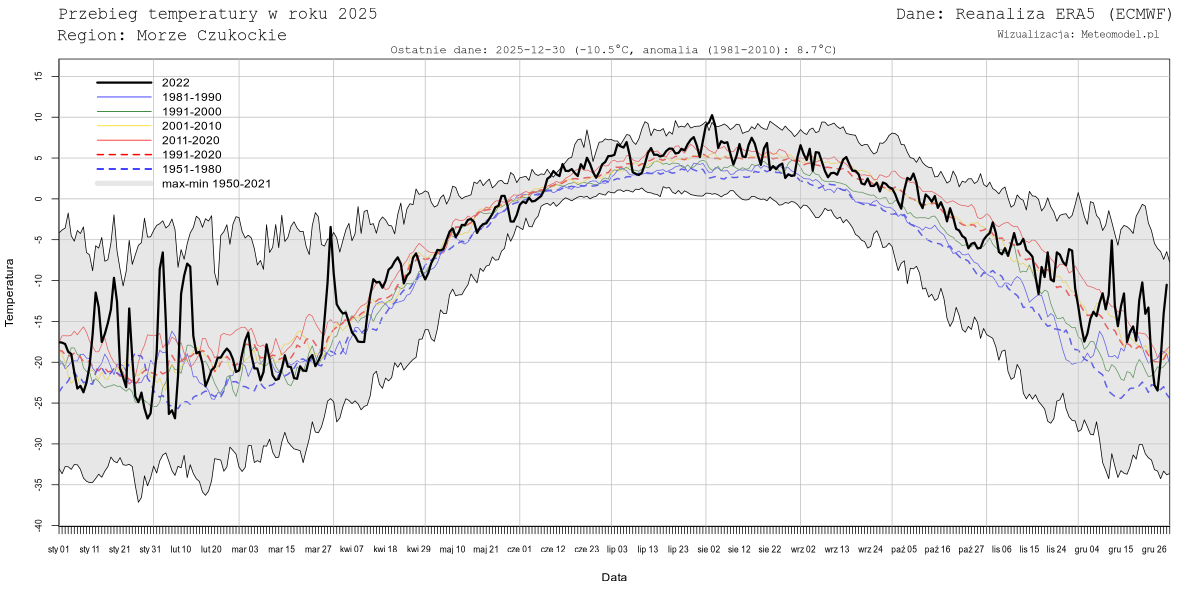 Wykresy prezentują przebieg temperatury na wysokości 2m w roku bieżącym na tle okresu wieloletniego. Dane pochodzą z reanalizy ERA5 (ECMWF) - patrz zakładka "Informacje".