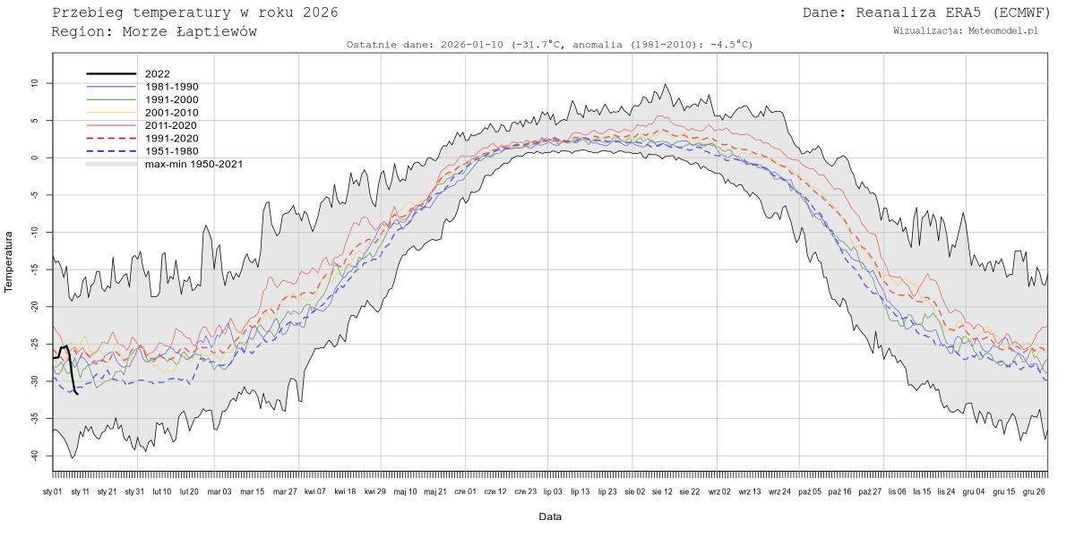 Obecnie nie dla wszystkich z ww. mórz generowane są dane. Należy też mieć na uwadze, że tzw. "Średnia Arktyki" oznacza temperaturę uśrednioną nad morzami arktycznymi z wyłączeniem Morza Grenlandzkiego, Norweskiego, Cieśniny Davisa, Cieśniny Hudsona, Zatoki Hudsona i dodatkowo przycięta do równoleżnika 69N.